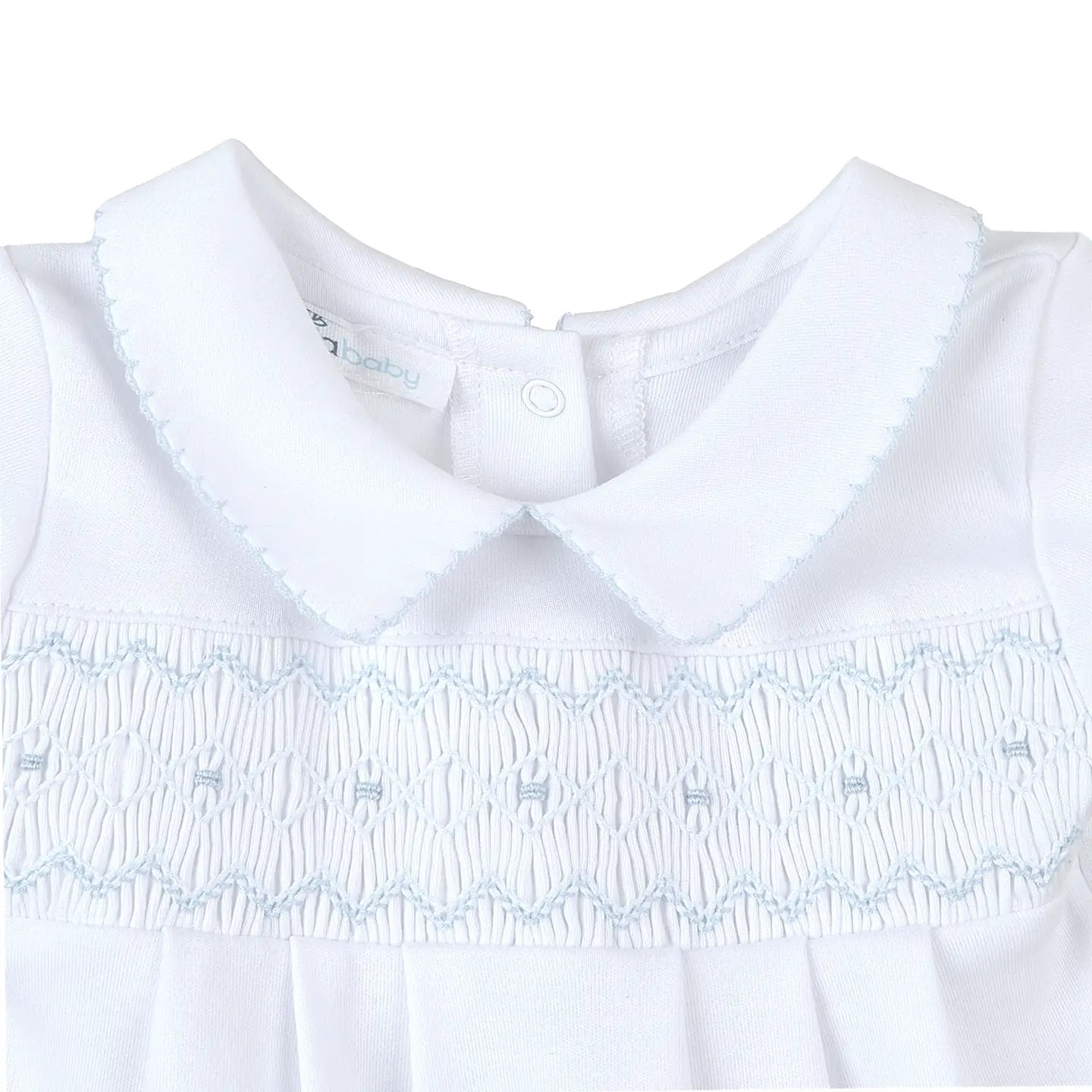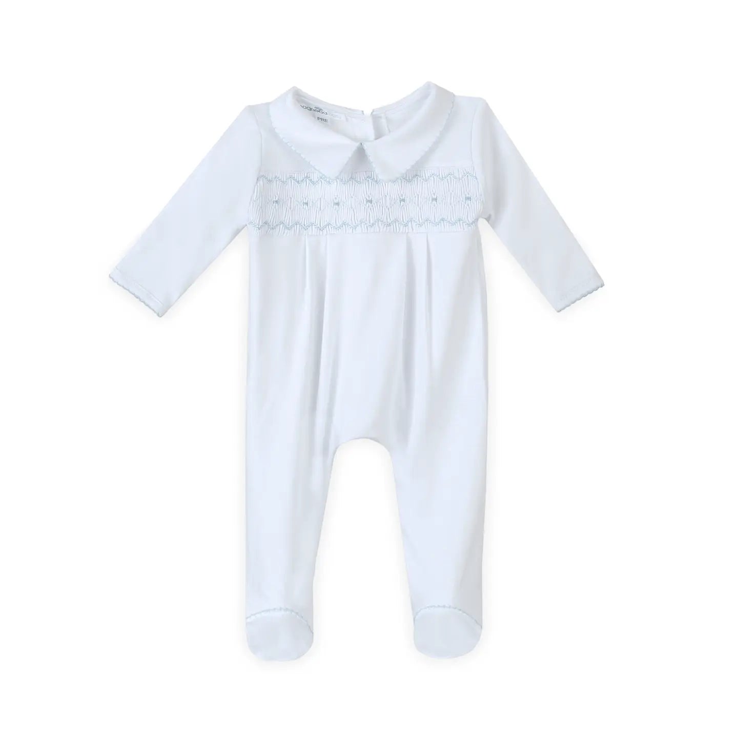 Magnolia Baby - Landon's Classics Smocked Footie - Light Blue A charming footie combining classic style with ultimate comfort. Features delicate smocking and a sweet light blue hue. Perfect for keeping your little one cozy and adorable from head to toe.