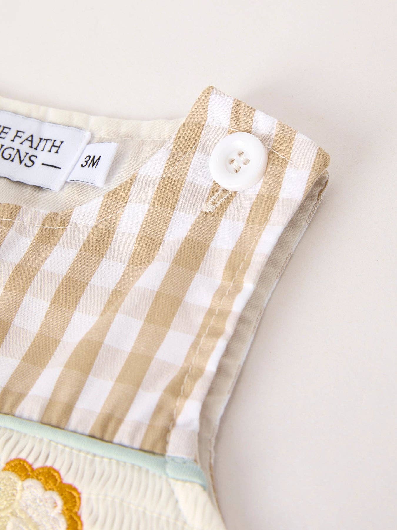 Dress your little one in cozy charm this season with the Thanksgiving Plaid Embroidery Romper. Featuring delicate smocking and adorable chick embroidery on a warm apricot plaid, this romper blends festive style with soft comfort. Perfect for holiday gatherings, it keeps your baby looking cute and feeling snug all day long.