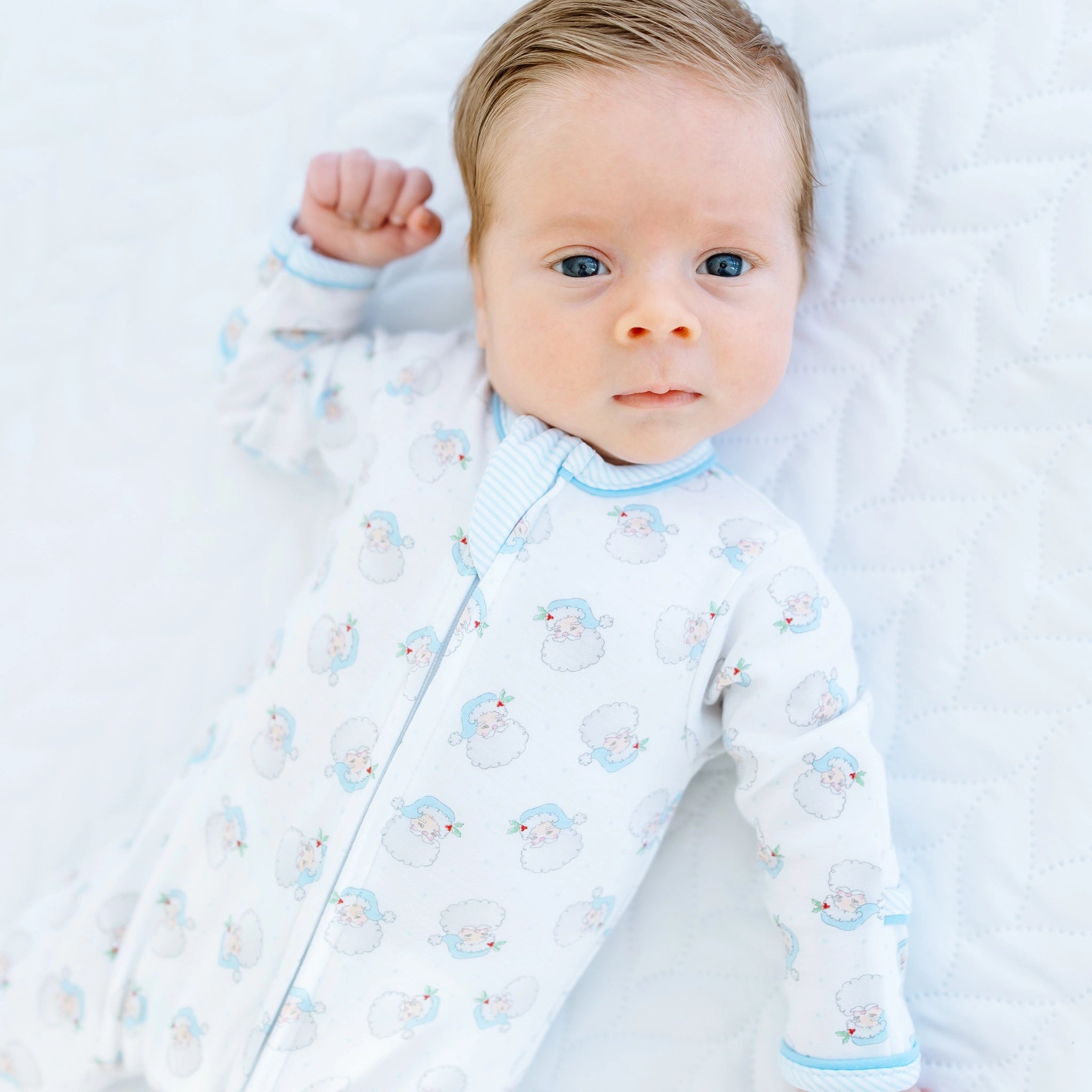 Simplify holiday dressing with our Santa Baby Print Ruffle Zip Footie - Light Blue. Inspired by the joyful spirit of Santa Claus, this charming white footie, crafted from luxurious Pima Cotton, features an all-over Santa print and a convenient two-way zipper.
