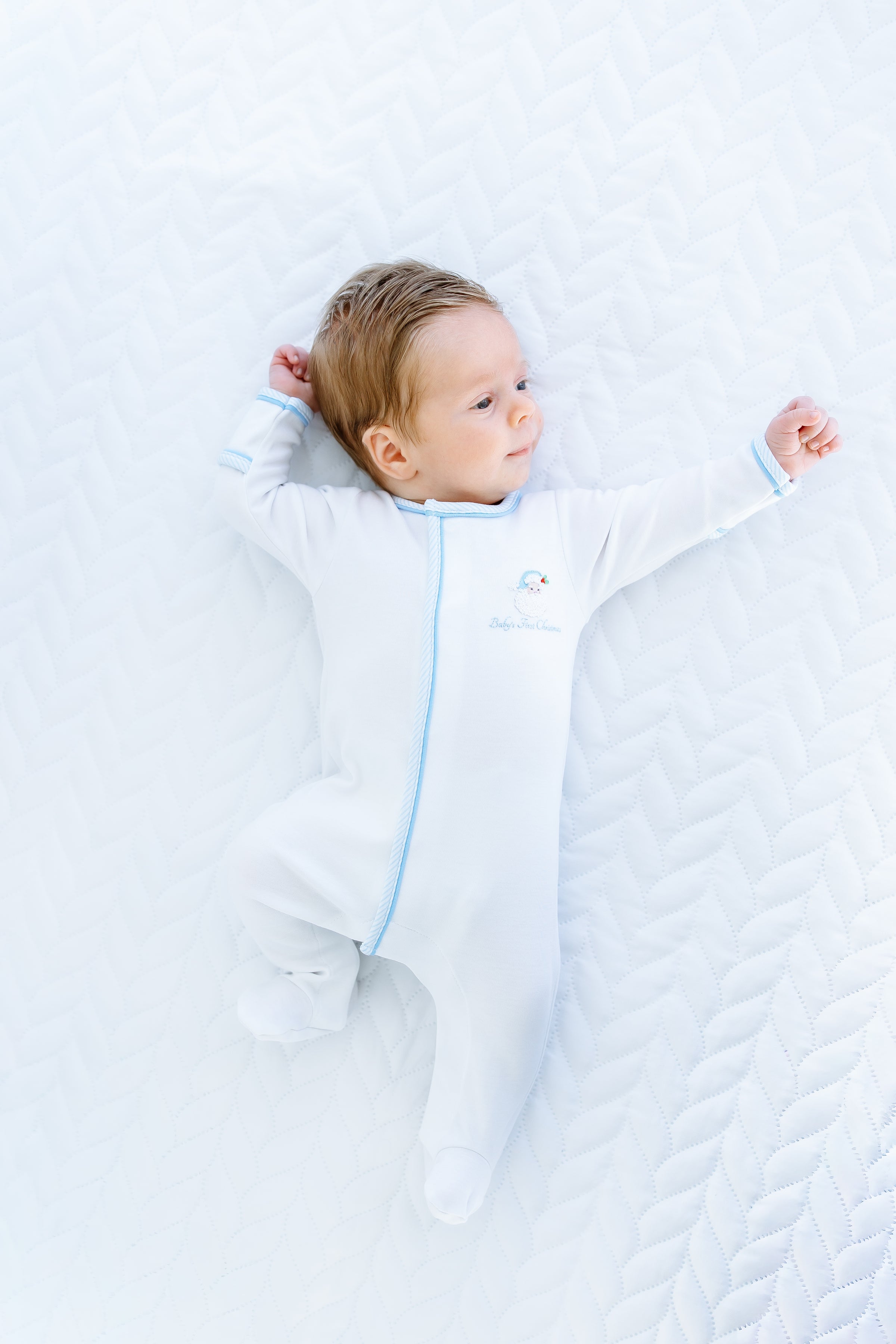 Celebrate a special milestone with our Santa Baby Embroidered Baby's First Christmas Footie - Light Blue. Inspired by the joyful spirit of Santa Claus, this charming white footie, crafted from luxurious Pima Cotton, features festive embroidery, making it a treasured keepsake for his first holiday.