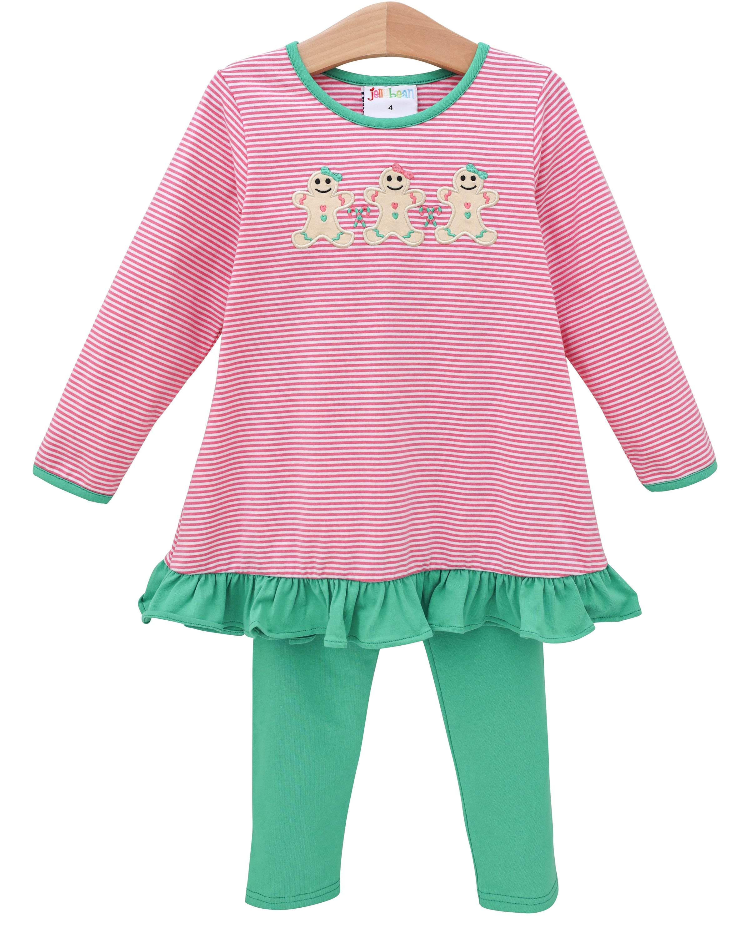 Dress your little one in festive fun with the Sweet Christmas Treat Ruffle Pants Set! This playful outfit features a long-sleeve pink striped top adorned with a charming green ruffle hem, paired perfectly with cozy green leggings. The highlight is the adorable applique trio of gingerbreads, adding a sweet holiday touch that’s sure to bring smiles all season long. Comfortable and cute, this set is perfect for holiday parties or cozy days at home.