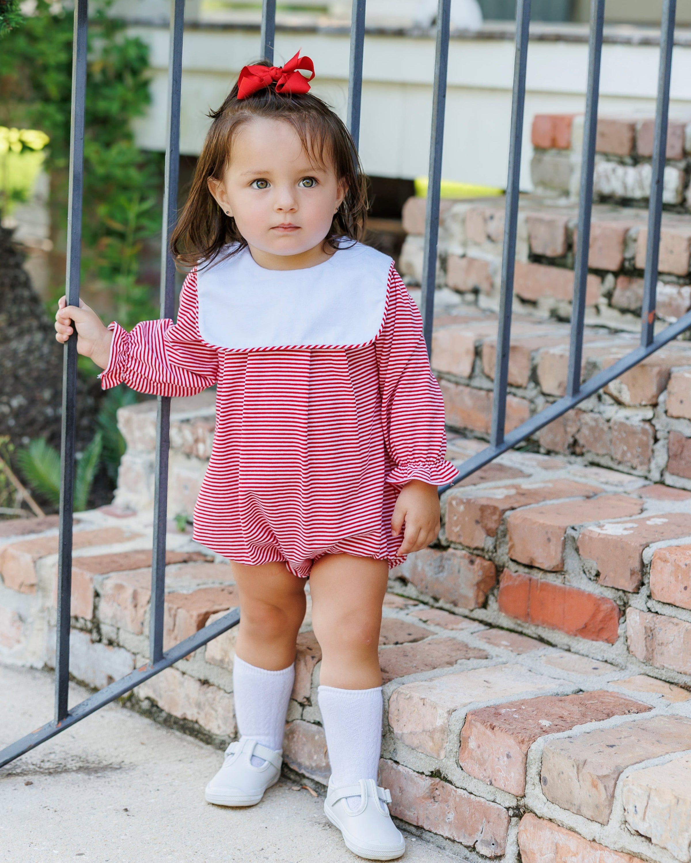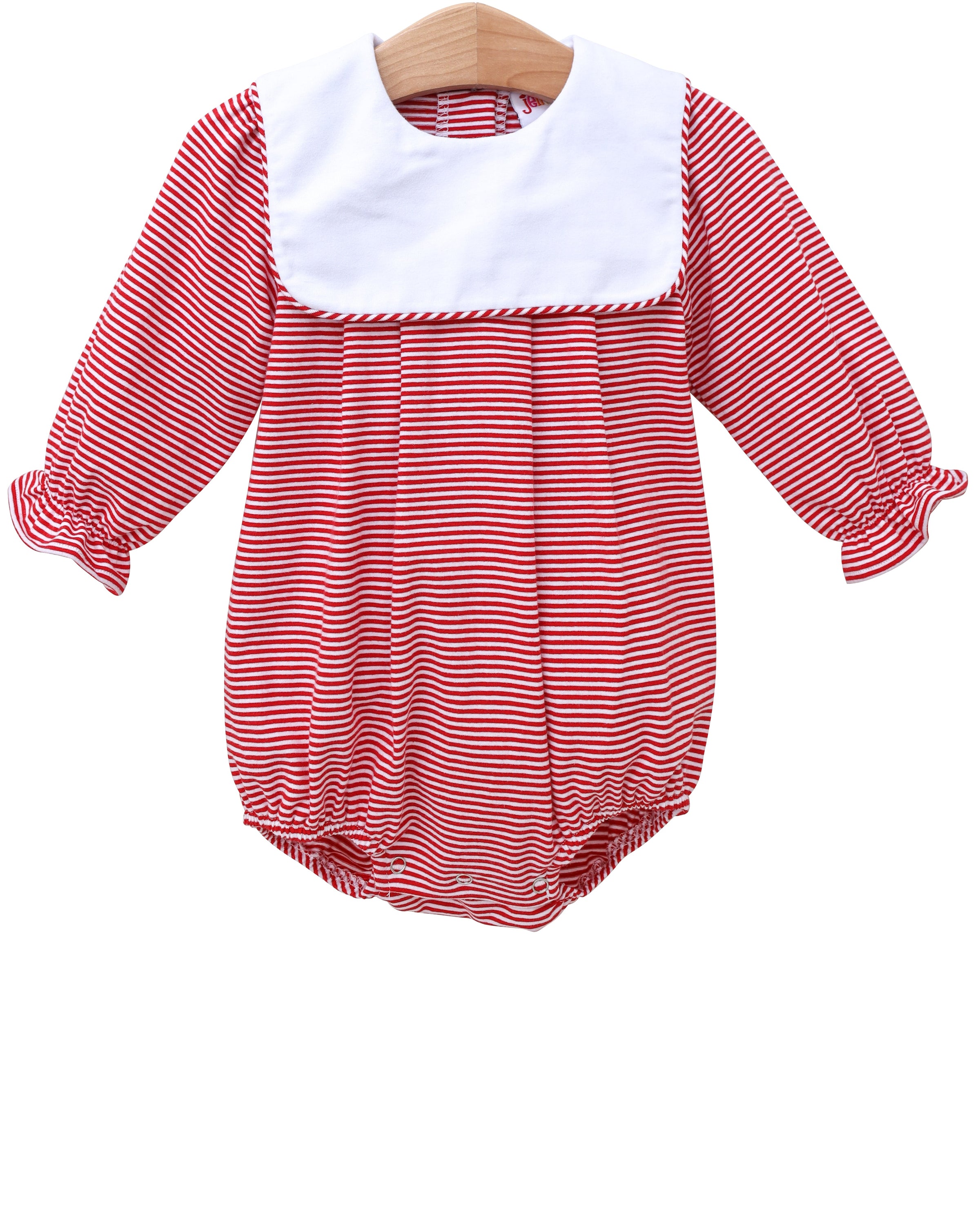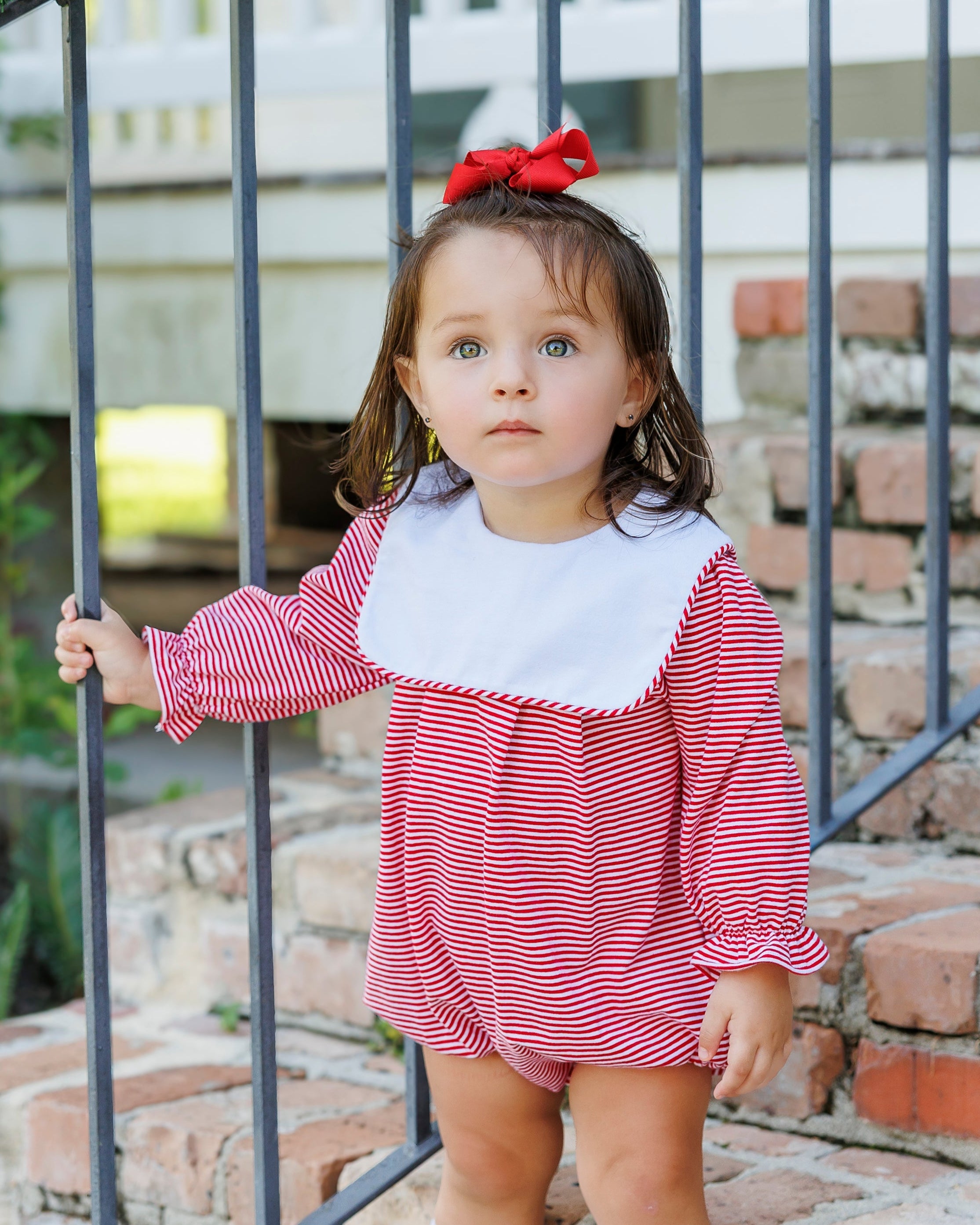 Introducing our Jane Bubble! This red striped treasure features a charming square collar and snuggly long sleeves that keep your little girl cozy during holiday adventures. The playful bubble silhouette adds a bounce to every step as she explores the colorful wonders of fall! Perfect as-is or add your personal touch.