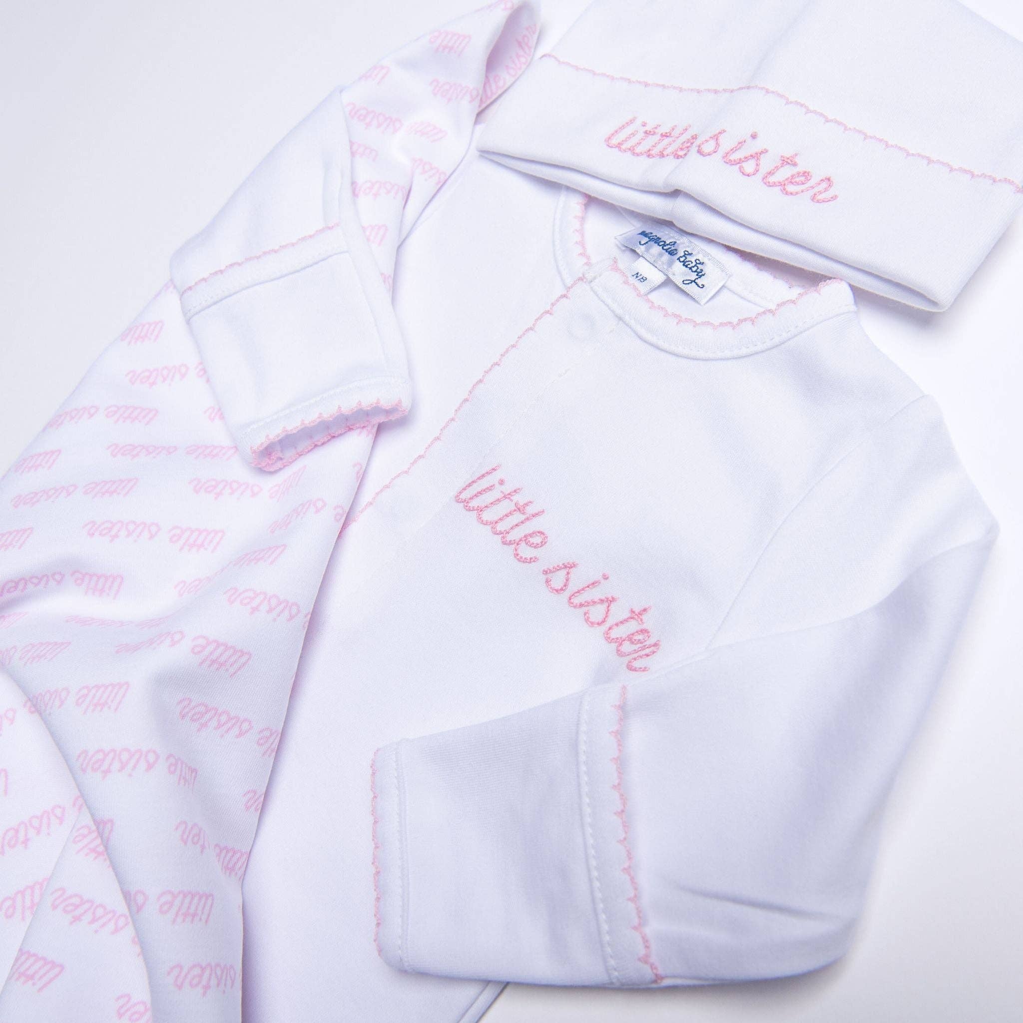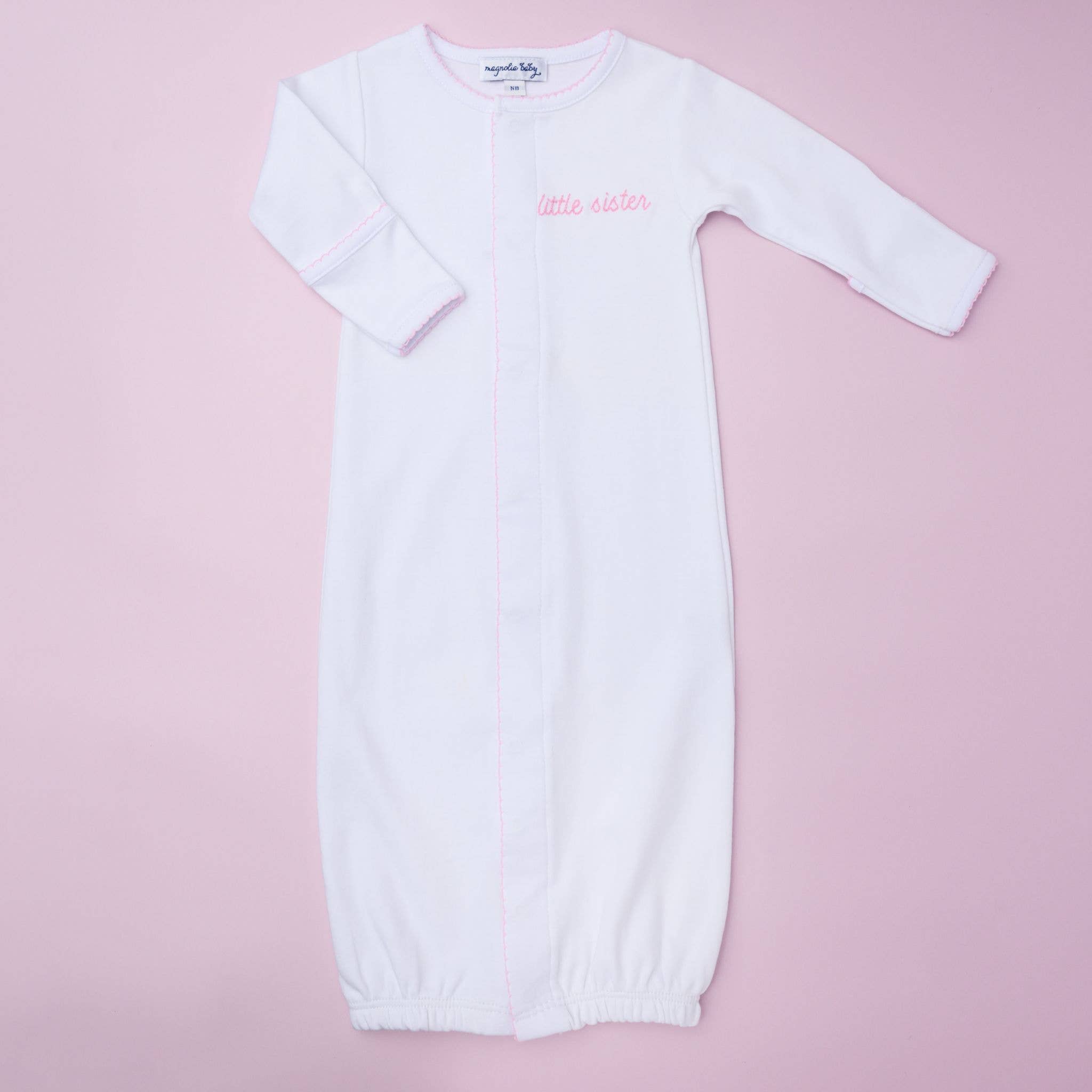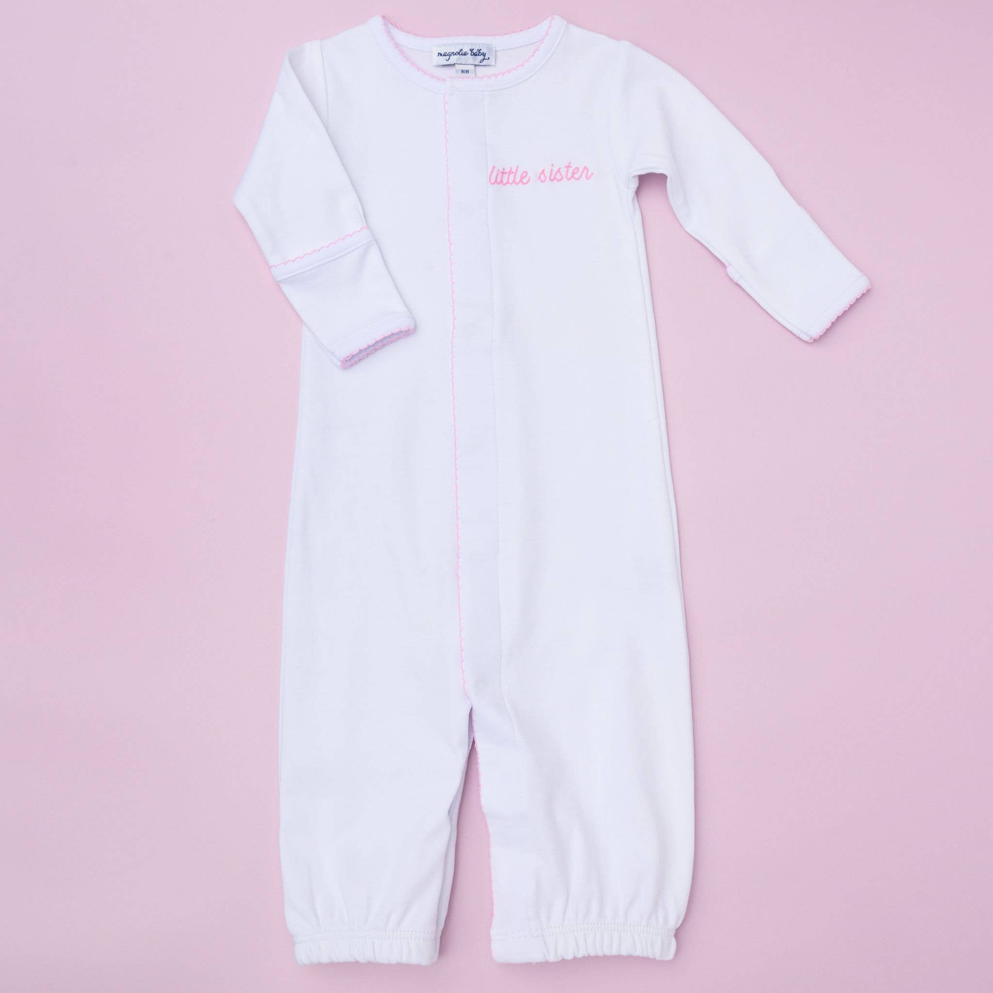 Meticulously hand-embroidered on premium Pima cotton, this Magnolia Baby converter is a testament to artistry and love. The delicate 'Little Sister' inscription makes it a unique gift to welcome a new addition. Its versatility and comfort will be treasured for years to come.